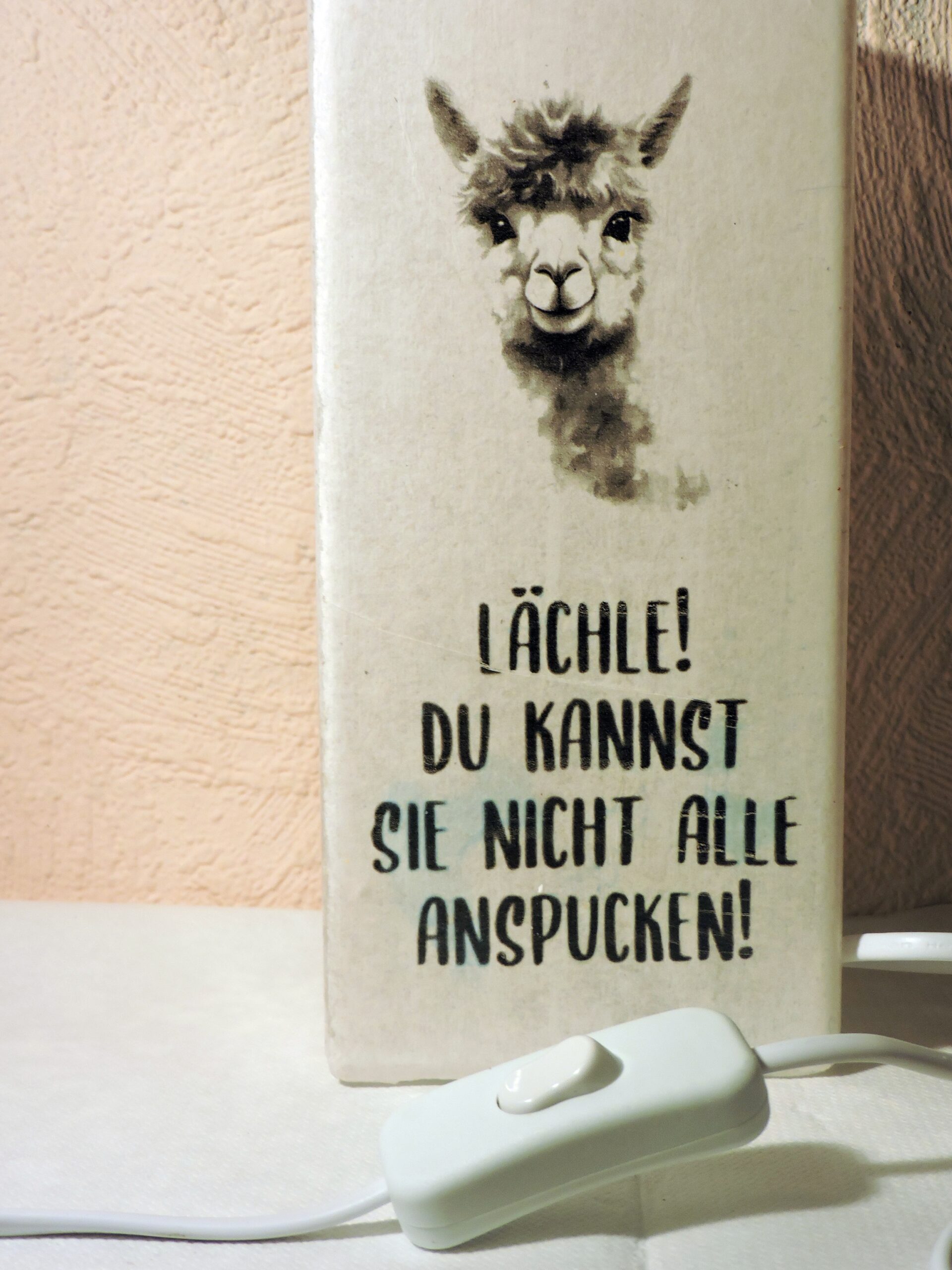 Diese originelle Lampe sorgt garantiert fĂŒr gute Laune! Das freche Alpaka-Motiv mit dem Spruch âLĂ€chle! Du kannst sie nicht alle anspucken!â macht die Lampe zu einem echten Hingucker â ob im Wohnzimmer, BĂŒro oder als Geschenk fĂŒr Alpaka-Fans.