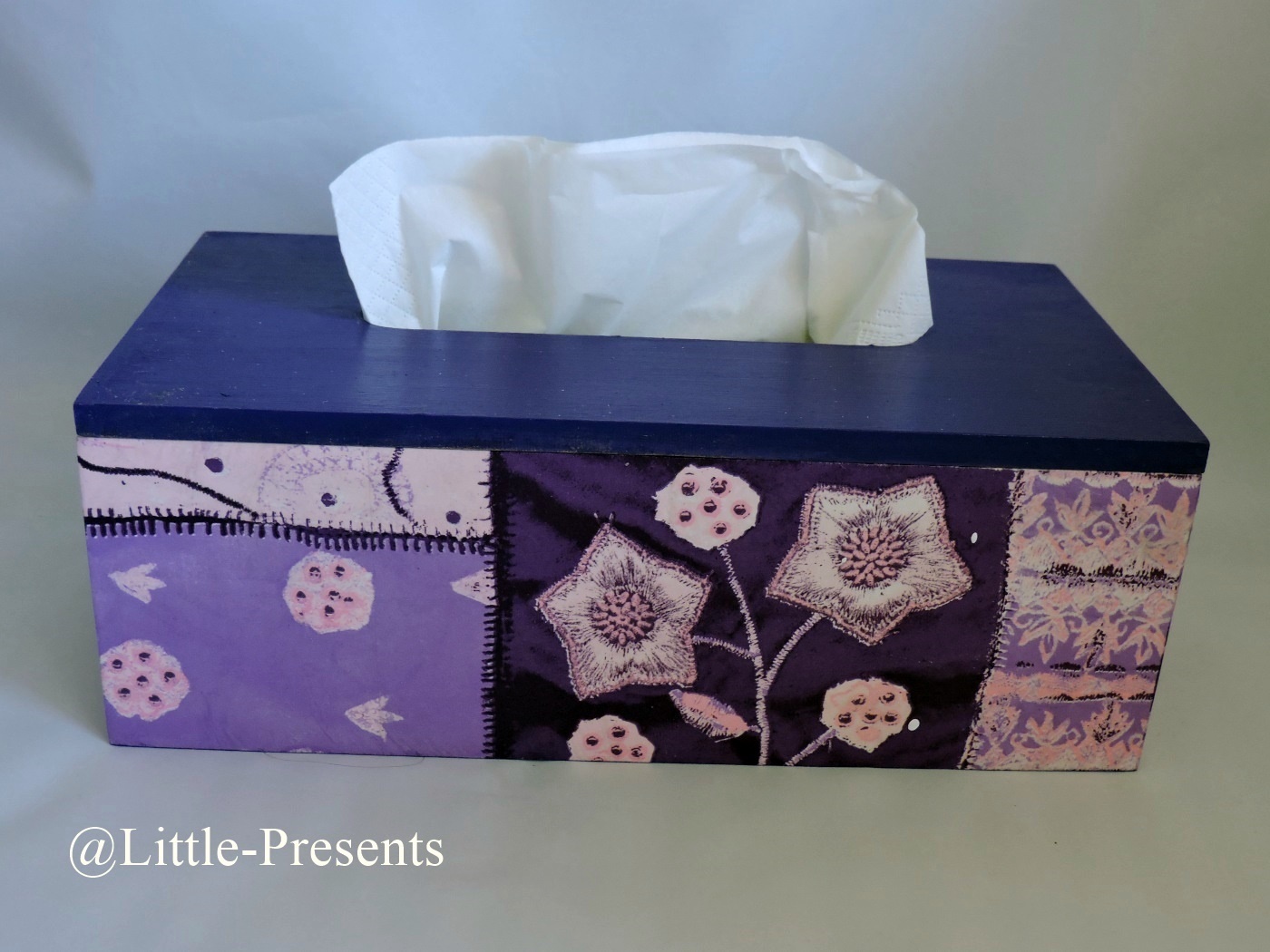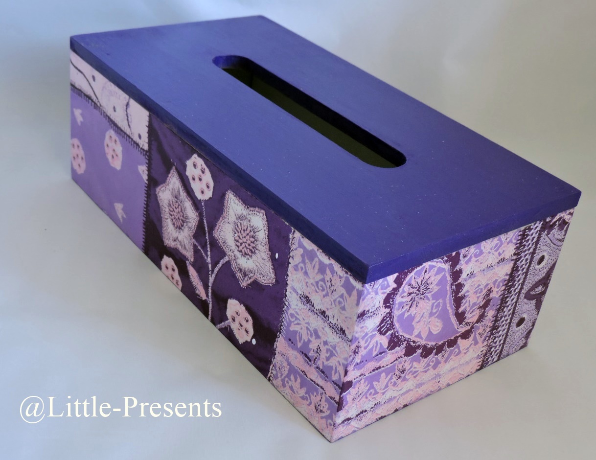 „Diese handgefertigte Tücherbox in Lila mit floralen Mustern wird durch die aufwendig gestaltete Decoupage-Technik zu einem besonderen Wohnaccessoire 🌸.